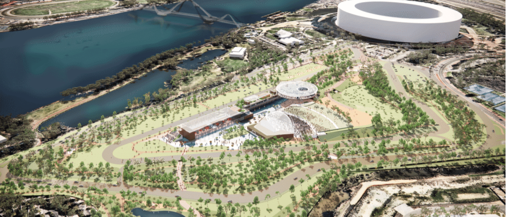 The WA Government's has unveiled plans for the Perth Park precinct in Burswood, releasing artist impressions of the proposed entertainment and sporting precinct and inviting community feedback. The precinct is set to integrate major venues including Optus Stadium and the State Tennis Centre on the Burswood Peninsula, alongside new parklands, event facilities and community spaces. Key features include landscaped parkland open year-round, an urban forest that will more than double the existing site's tree canopy, a multi-use building for sport and events, a 12,000-capacity outdoor amphitheatre, and a track designed for cycling training and motorsport events.