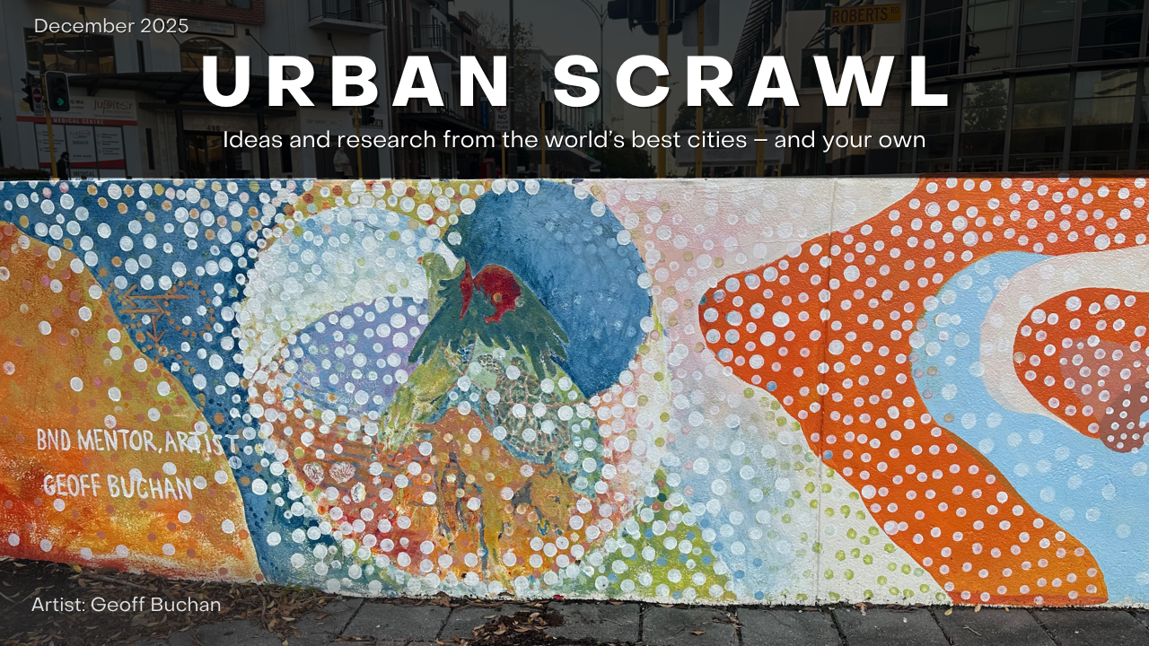 Urban Scrawl is shaped by ideas and actions from around the world. If you’ve seen something while travelling, read an article that stuck with you, heard a great conversation, or are working on a project that’s reshaping how cities work and grow, we’d love to hear about it. Share it with us and help shape future editions: enquiries@committeeforperth.com.au